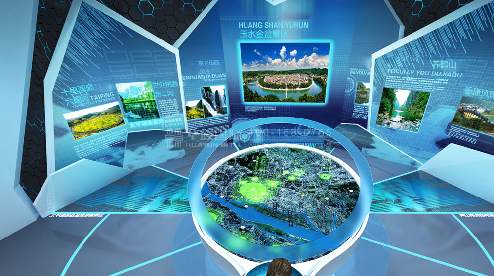 該展廳設計以“中國天眼”為設計靈感,用天眼(天坑)的科幻模擬造型,結合樓體外觀,整體打造“開眼看世界”的印象格局。利用磁懸浮技術,設置多個球幕,在空中懸浮上升、下降,讓游客體驗天體運動場景,各球幕呈現當地代表性景觀。并通過虛擬導游的方式,游客可具體了解本地各個景區的信息,合理規劃旅游行程安排。還以交通規劃切入,按動觸控屏,即可點亮河流帶,實現實時交通交互;可查詢到周邊的交通規劃,吃、住、行、游、購、娛旅游產業鏈等。
